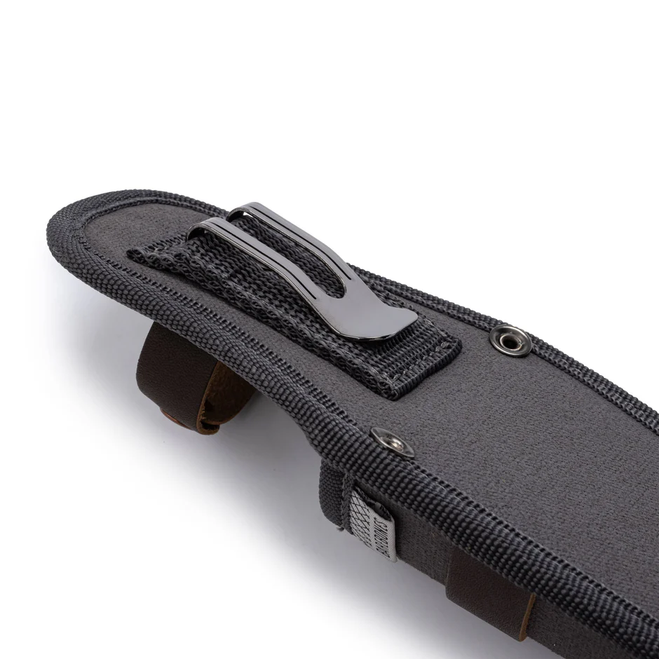 The ultimate shield for the ultimate tool, the Hori Hori Sheath unites utility and design. Made of 900D polyester with an interior liner, it weathers real-world use while protecting the edge from dulling. Stainless steel belt clip supports easy carrying and accessibility, while the strong handle strap restricts the blade from slipping or moving. Open-end allows for easy cleaning and prevents soil buildup, preserving the blade for years of continued use. Accented with full-grain leather and copper to complement the rest of our Woodsman Collection.